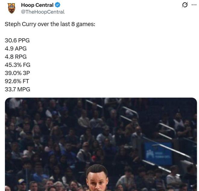 這也是庫里進入12月以來好狀態的縮影,過去8場比賽庫里場均可以拿下30.6分4.8板4.9助,三項命中率為45.3%、39%、92.6%。