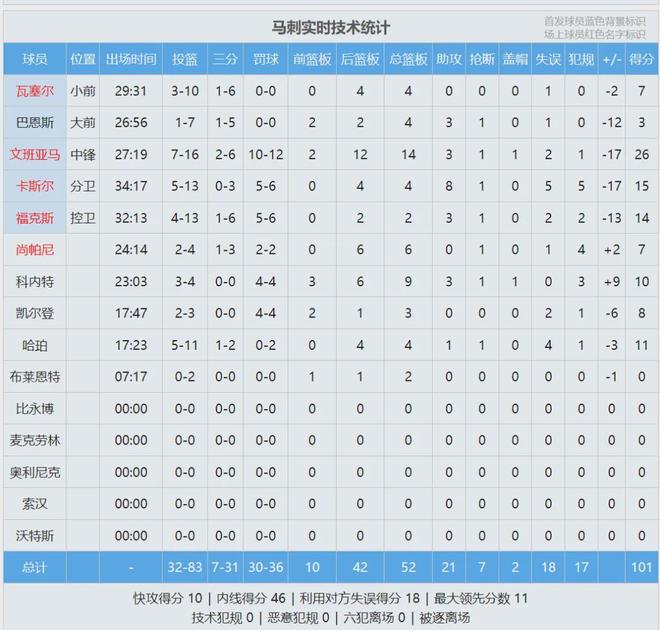 文班復(fù)出之后打了9場(chǎng)比賽,前7場(chǎng)替補(bǔ)出戰(zhàn),馬刺6勝1負(fù);最近兩場(chǎng)比賽,文班重返首發(fā)陣容,馬刺0勝2負(fù)。今天文班投籃16中7,三分6中2,罰球12中10,拿到26分14籃板3助攻1搶斷1蓋帽2失誤,正負(fù)值-17并列全場(chǎng)最低。