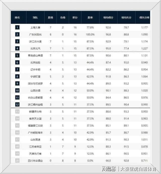 ②、8戰全勝的廣東男籃屈居第二;衛冕冠軍廣廈男籃7勝1負排名第3;