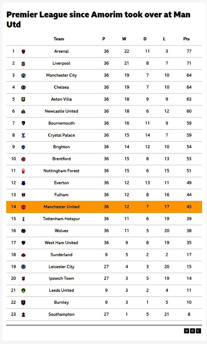 在曼聯的一年之間,阿莫林輸掉了52場比賽中的19場,他在場邊有時候顯得頗為消極,頹然地蹲著,或者仰頭望天。